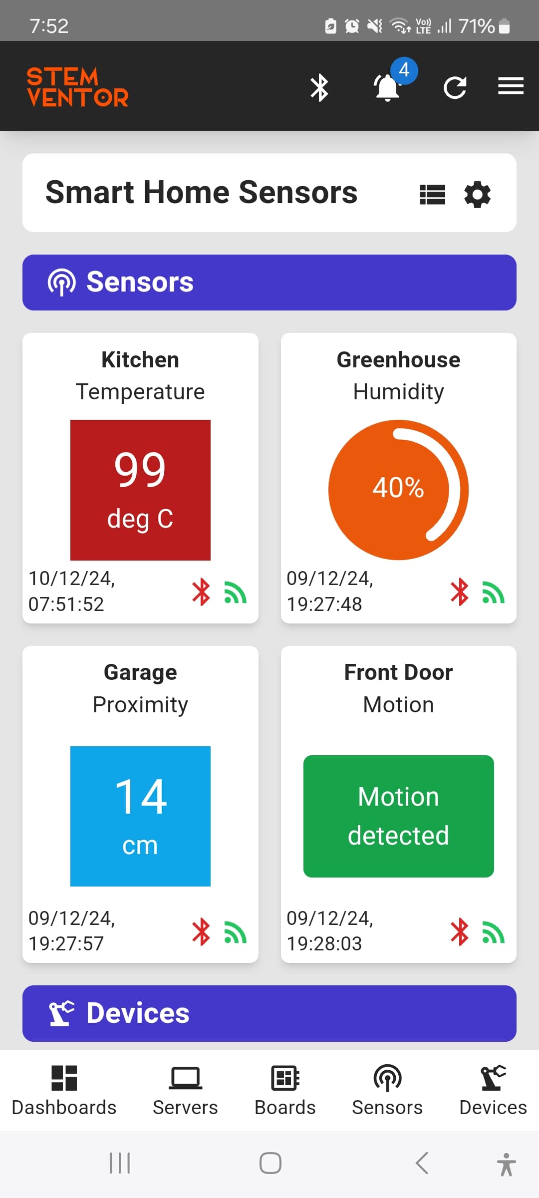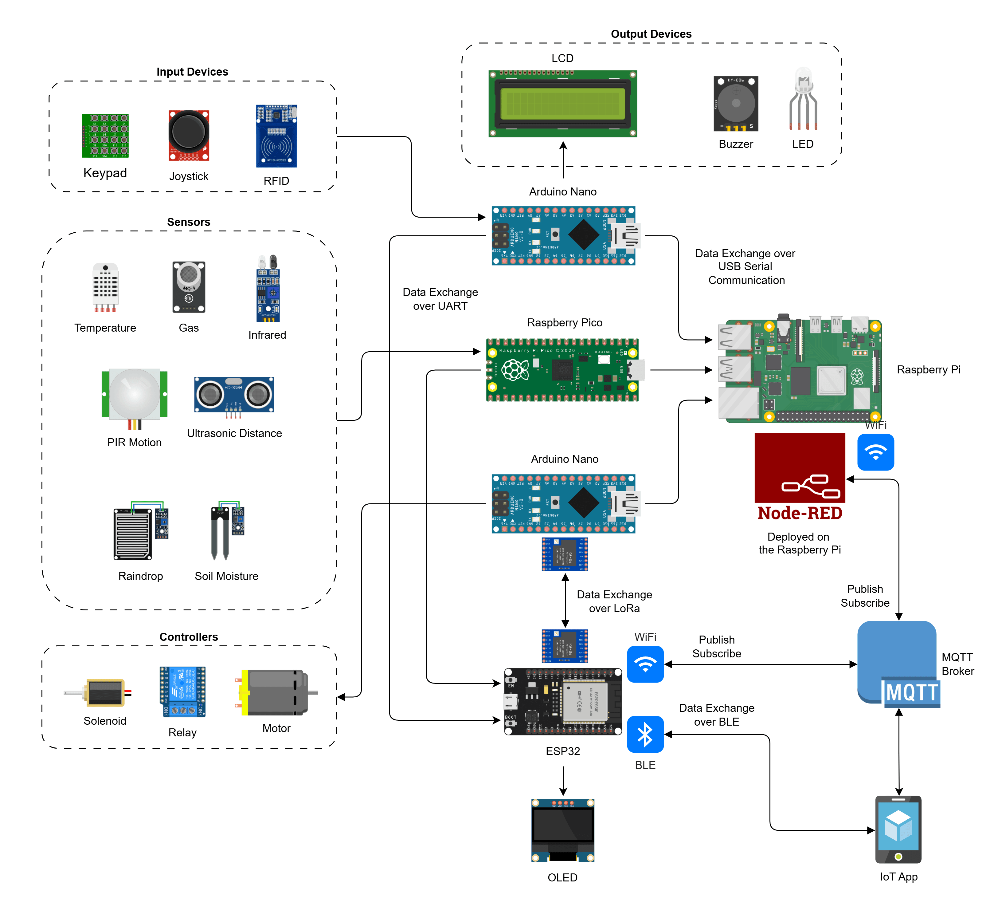 The final solution you will have built at the end of these learning sessions is shown above. It will have a collection of sensors and controllers that you can monitor and control using the STEMVentor IoT App over the Internet using WiFi and via BLE.